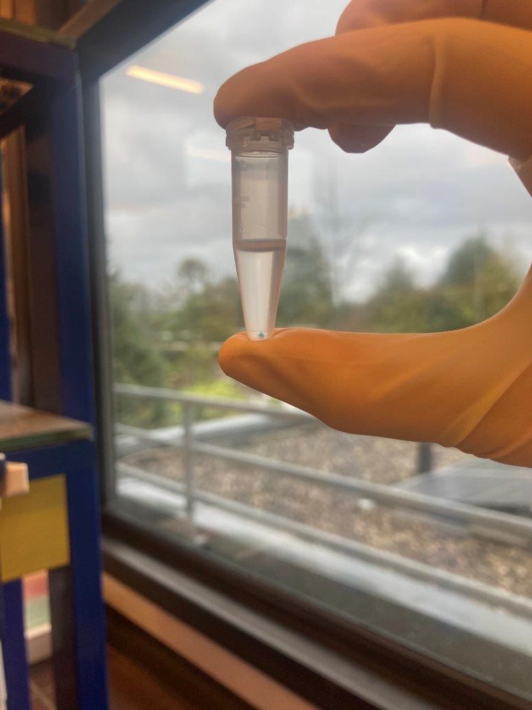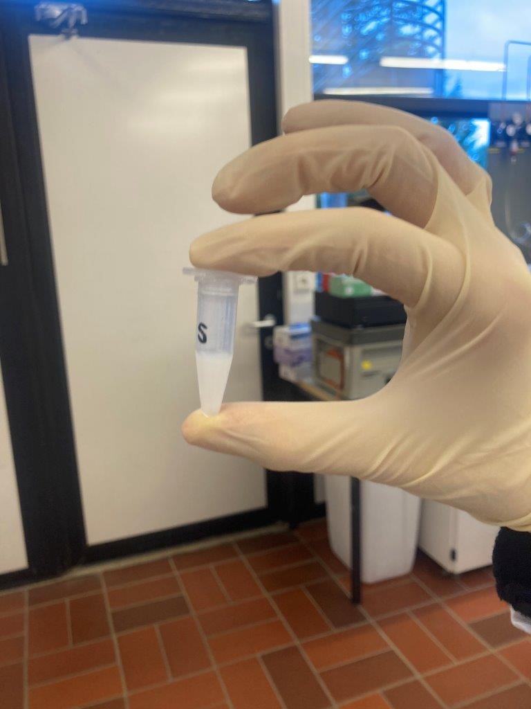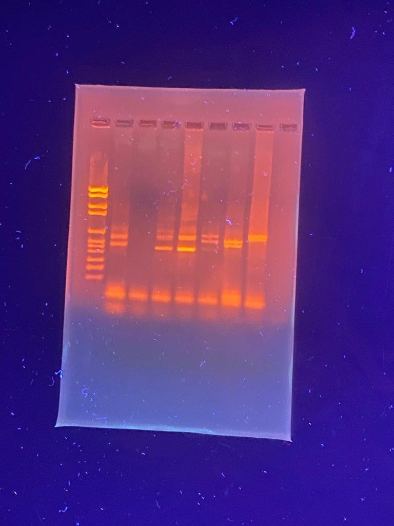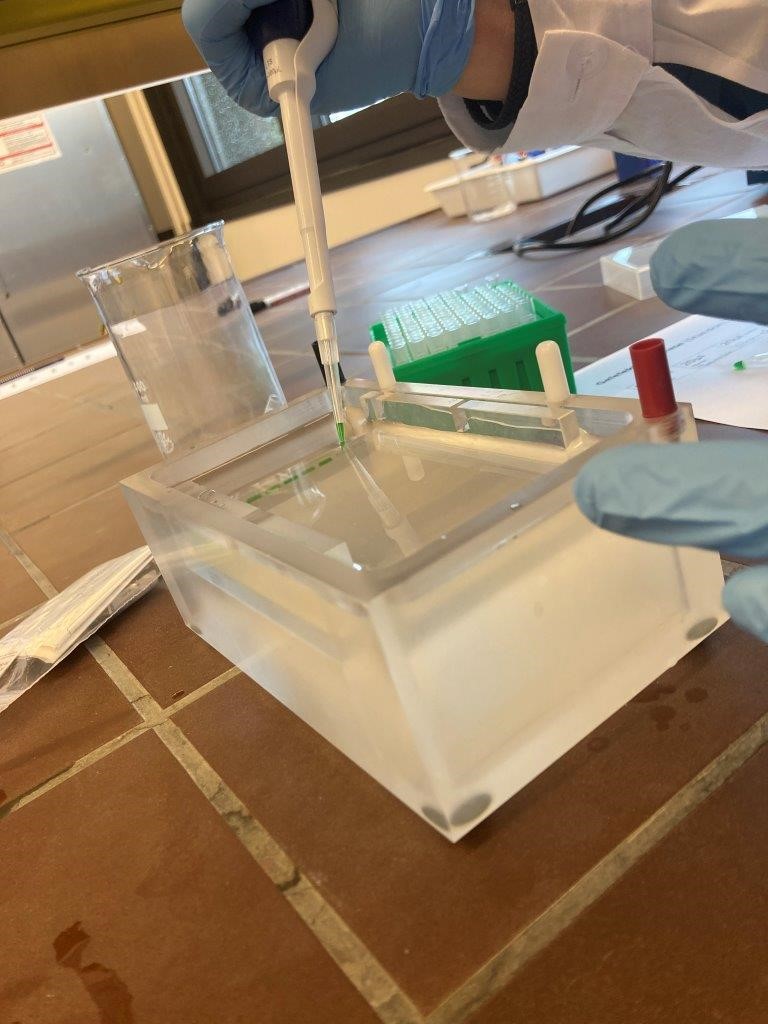 Nachdem die Sicherheitsvorschriften kurz vorgestellt worden waren, ging es unmittelbar zu den Laborarbeitsplätzen. Zunächst mussten wir unsere DNA aus Mundschleimhautzellen aufreinigen, dazu entnahmen Zellmaterial aus unserer Mundhöhle und behandelten es mit speziellen Chemikalien, um die DNA von anderen Zellbestandteilen zu trennen. Im nächsten Schritt ging es darum, die gewonnene DNA millionenfach zu vervielfältigen. Dies geschieht mithilfe der Polymerase-Kettenreaktion (PCR), einer Methode, die man aus der Coronazeit von den PCR-Tests kennt. Durch Temperaturzyklen wird die DNA in einem speziellen Gerät, dem Thermocycler, vervielfältigt. Dadurch entsteht eine ausreichende Menge an genetischem Material, um es anschließend analysieren zu können. Der letzte und vielleicht spannendste Teil war die Gelelektrophorese. Hierbei wird die vervielfältigte DNA auf ein spezielles Gel aufgetragen und durch Anlegen einer elektrischen Spannung nach Größe aufgetrennt. Da jedes Individuum eine einzigartige Anordnung von sogenannten Minisatelliten in der DNA hat, entsteht ein genetischer „Fingerprint“. Am Ende konnten wir mit UV-Licht unsere eigenen DNA-Banden sichtbar machen, ein faszinierender Moment.