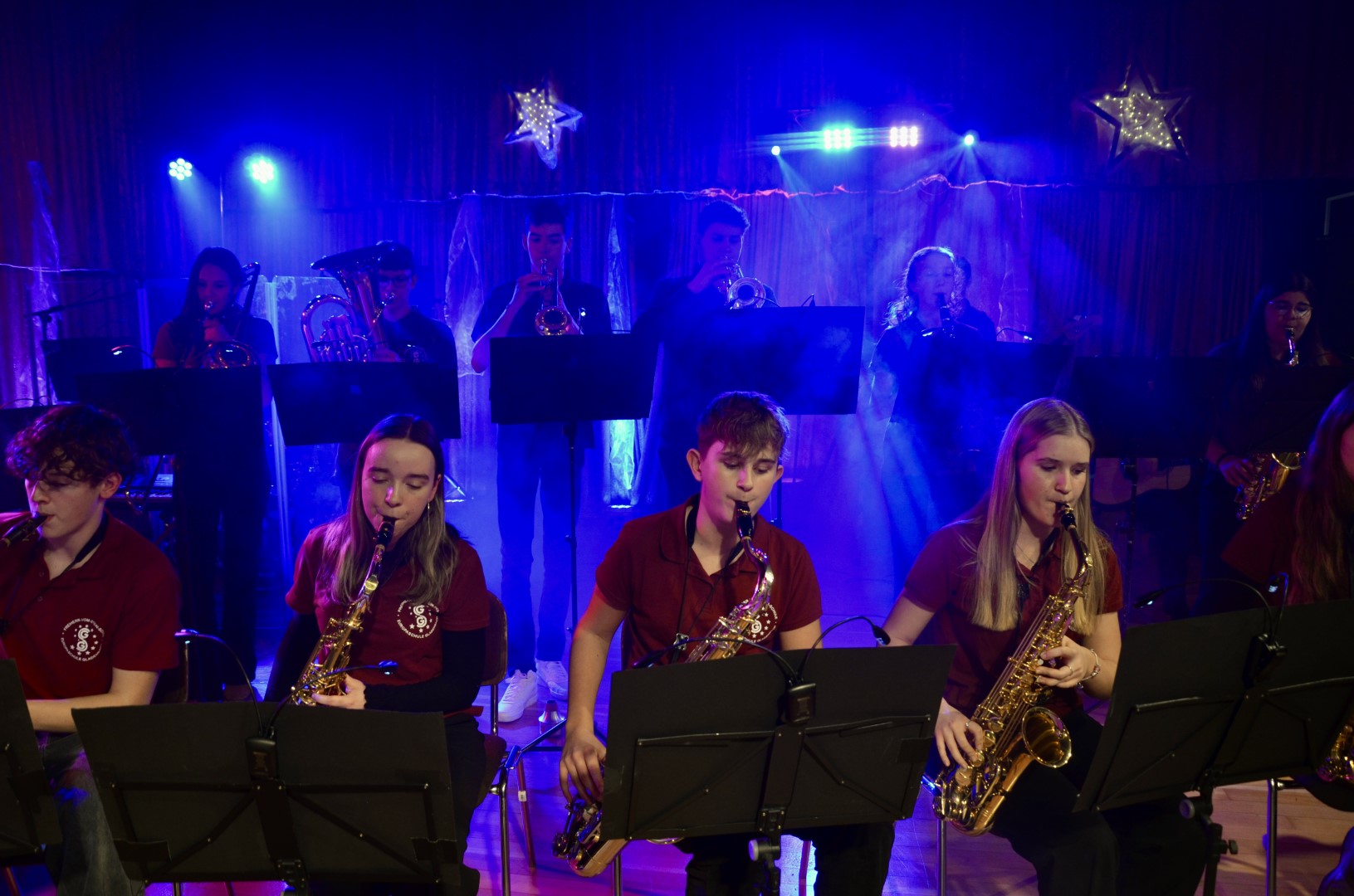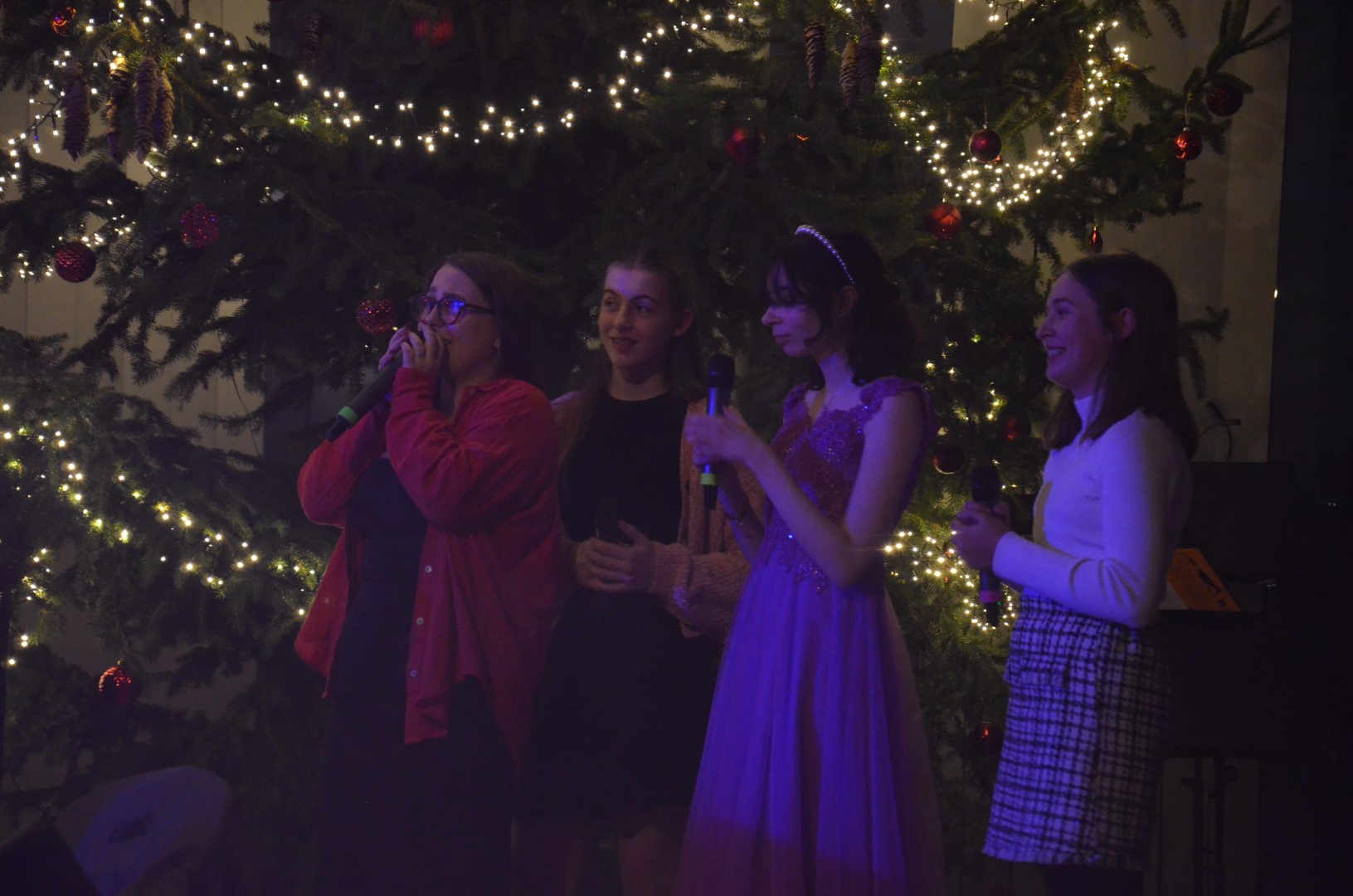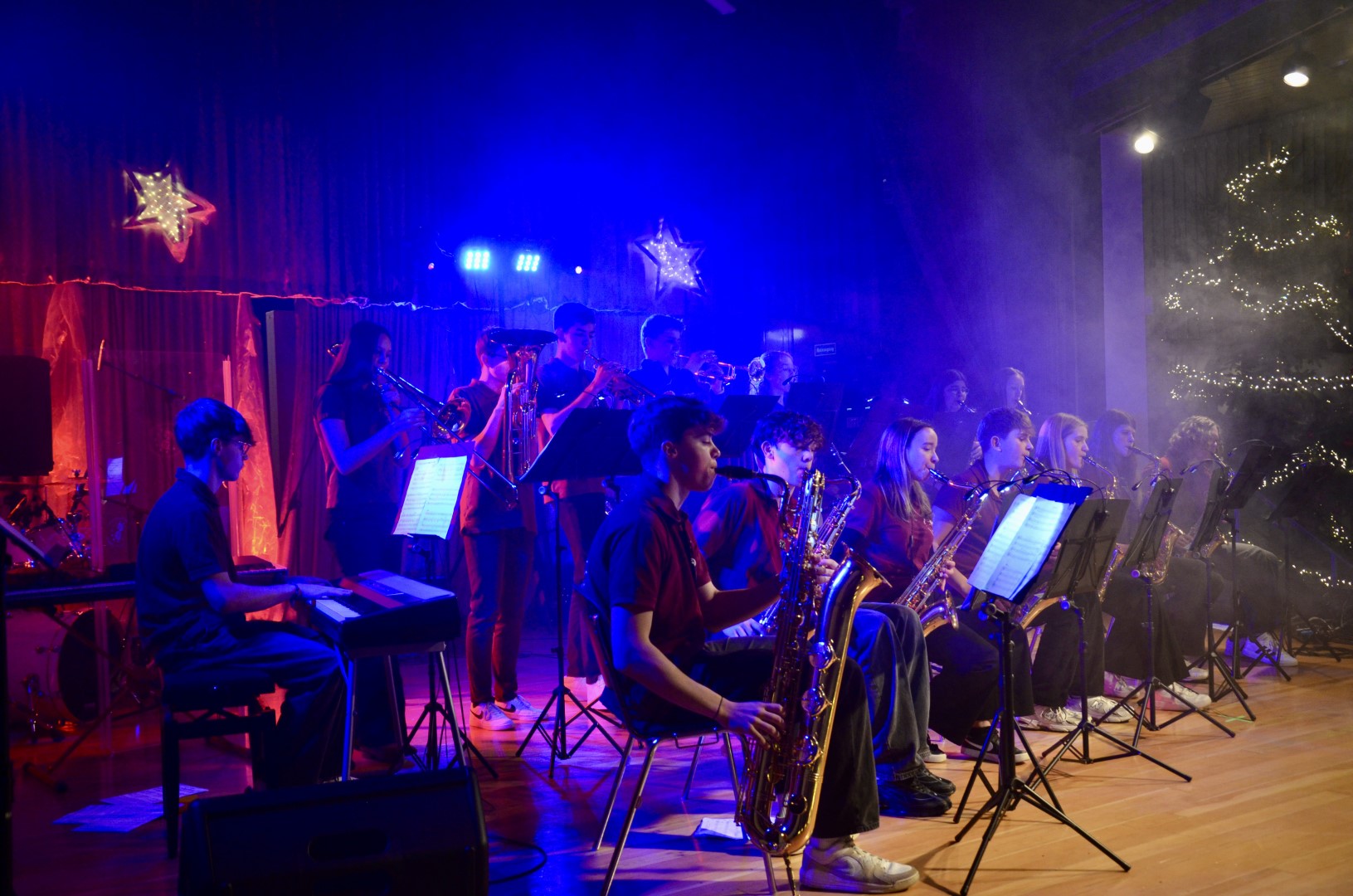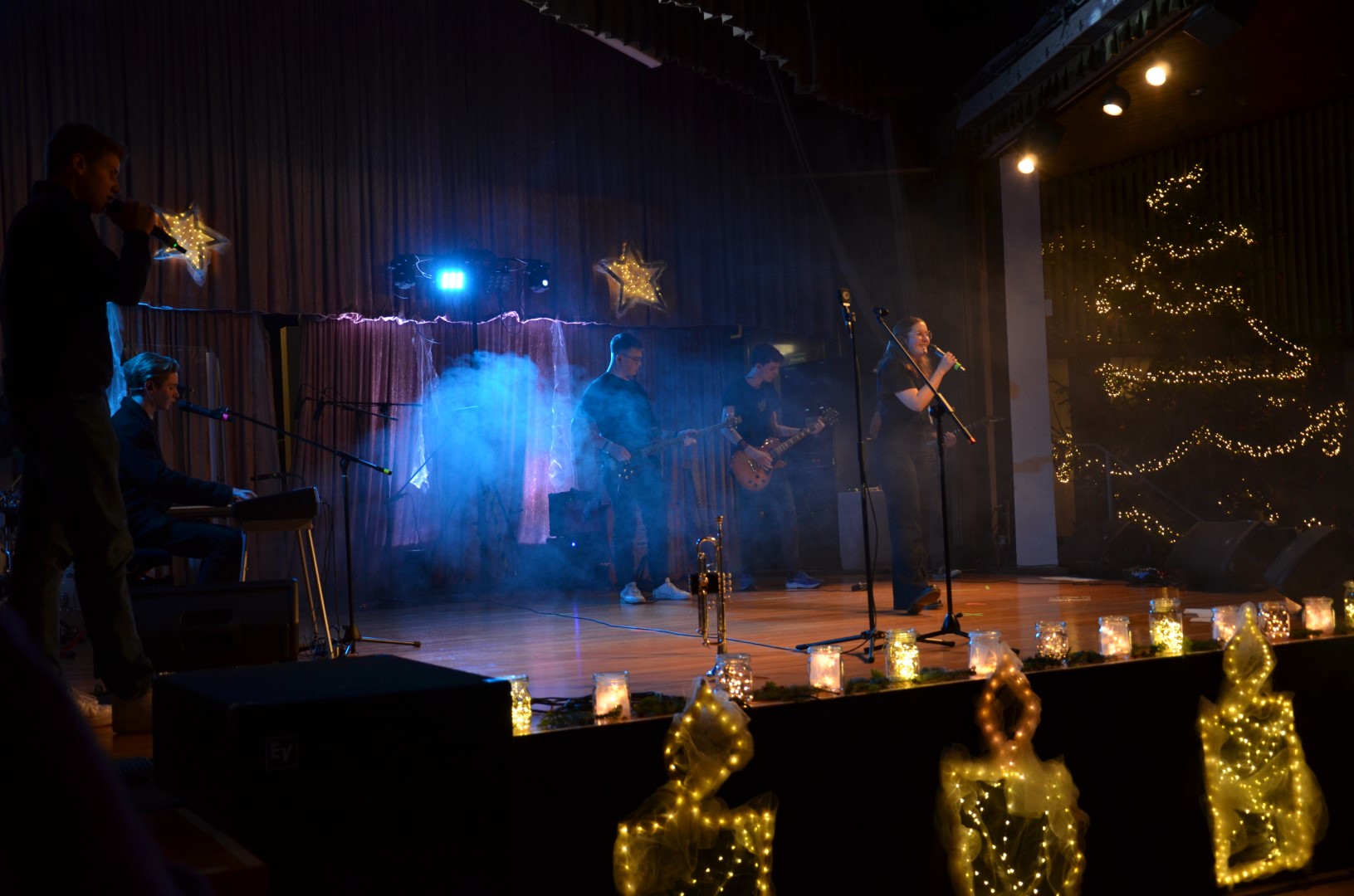 Drei Bands traten im Anschluss auf und sorgten für eine musikalische Reise durch verschiedene Genres. Die Juniorband, geleitet von Christina Guhl, begann u.a. sanft mit „Jingle Bells“ und „O Come All Ye Faithful“, gefolgt von der Schülerband, die ihren ersten, aber sicherlich nicht letzten Auftritt meisterte. Mit einer kraftvollen Interpretation des „Little Drummer Boy“ und Shakin’ Stevens‘ „Merry Christmas Everyone“ animierten die Schülerin und die Schüler der Oberstufe das Publikum zum Mitsingen und heizten mit dem energiegeladenen „Narcotic“ von „Liquido“ den Saal ein.