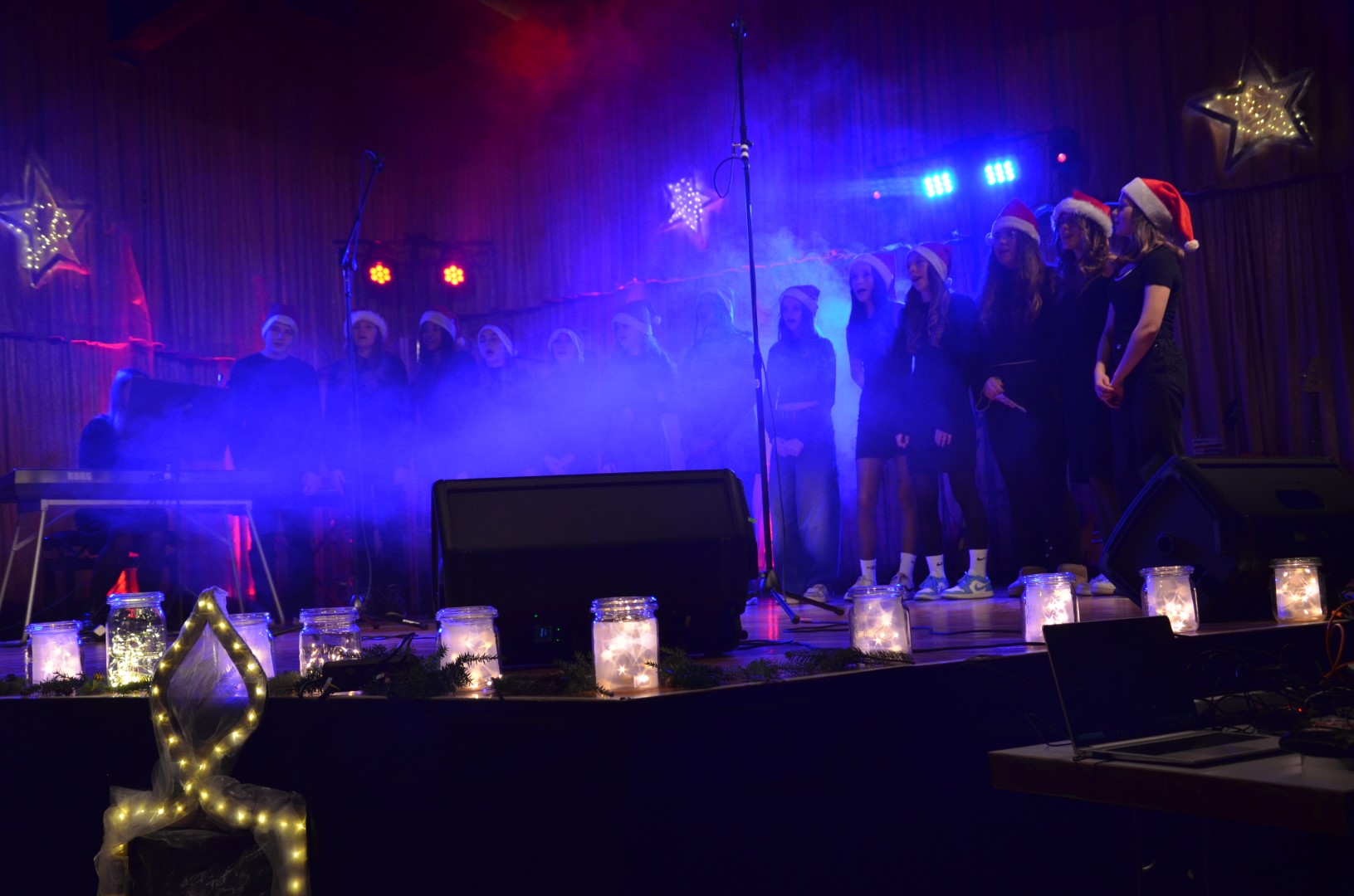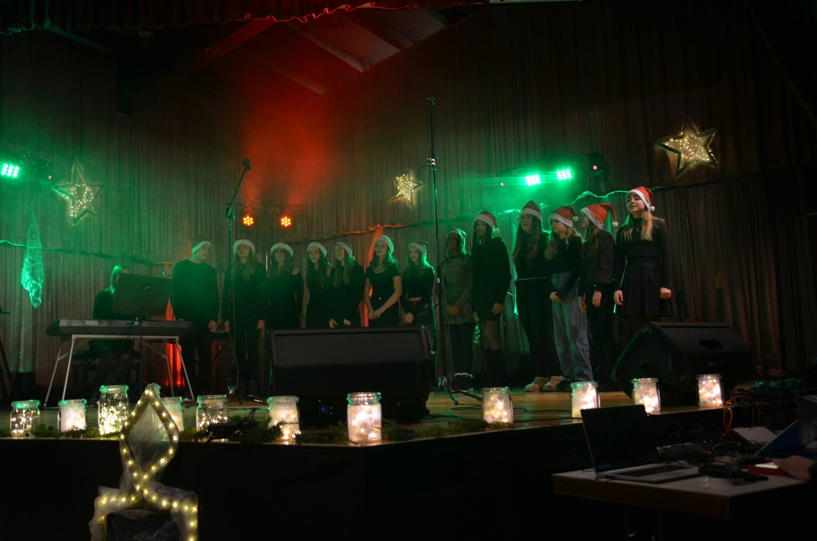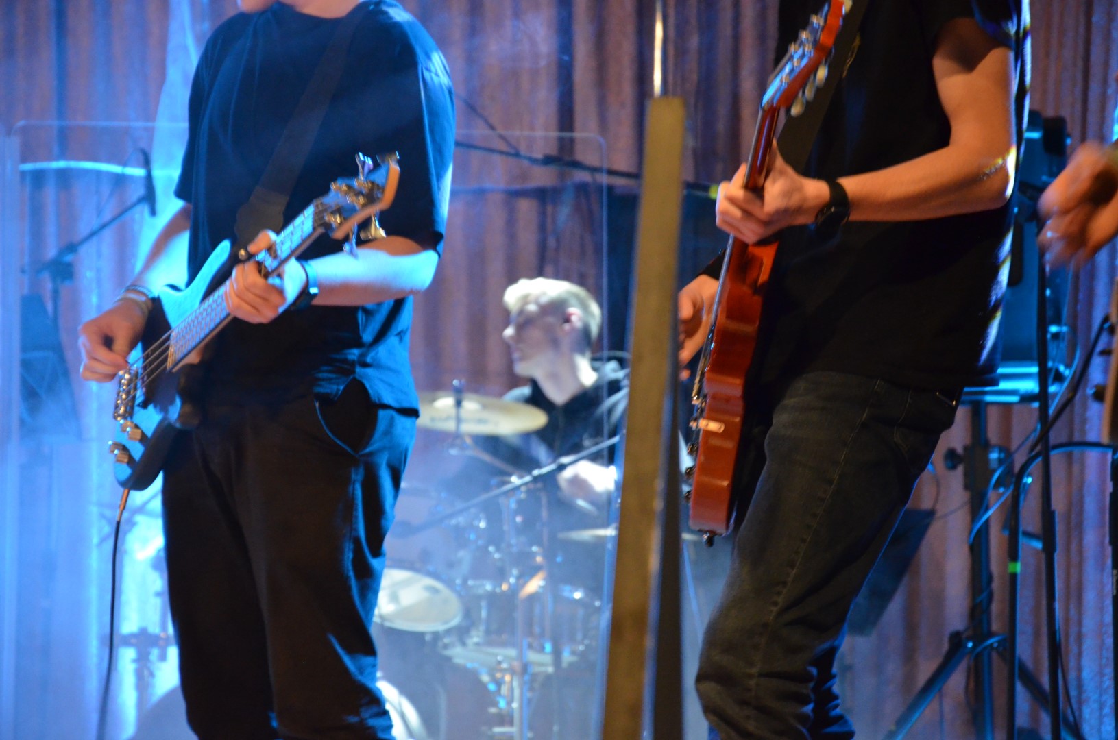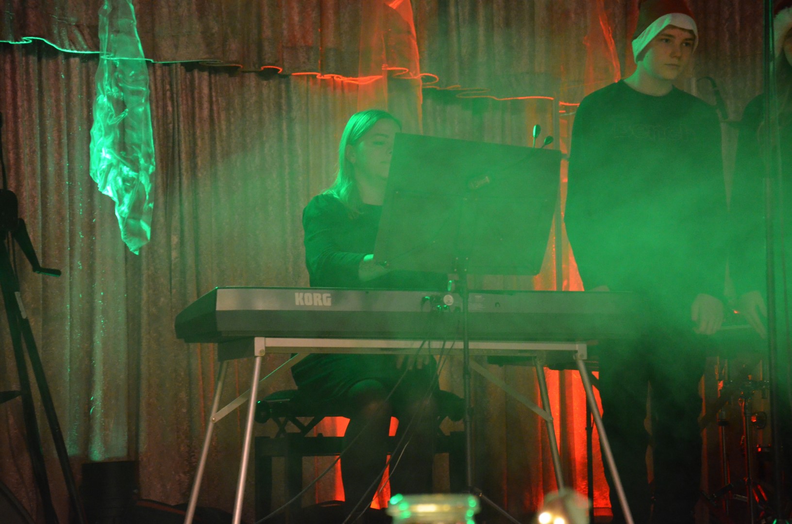 Drei Bands traten im Anschluss auf und sorgten für eine musikalische Reise durch verschiedene Genres. Die Juniorband, geleitet von Christina Guhl, begann u.a. sanft mit „Jingle Bells“ und „O Come All Ye Faithful“, gefolgt von der Schülerband, die ihren ersten, aber sicherlich nicht letzten Auftritt meisterte. Mit einer kraftvollen Interpretation des „Little Drummer Boy“ und Shakin’ Stevens‘ „Merry Christmas Everyone“ animierten die Schülerin und die Schüler der Oberstufe das Publikum zum Mitsingen und heizten mit dem energiegeladenen „Narcotic“ von „Liquido“ den Saal ein.