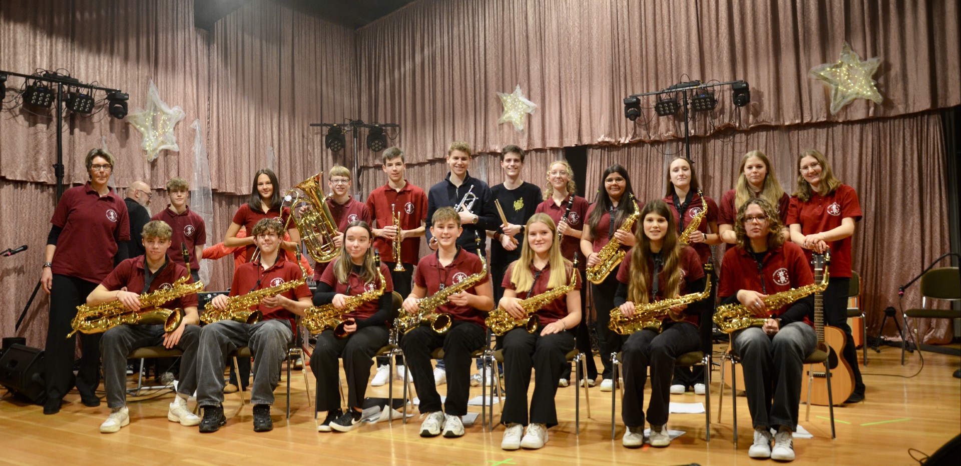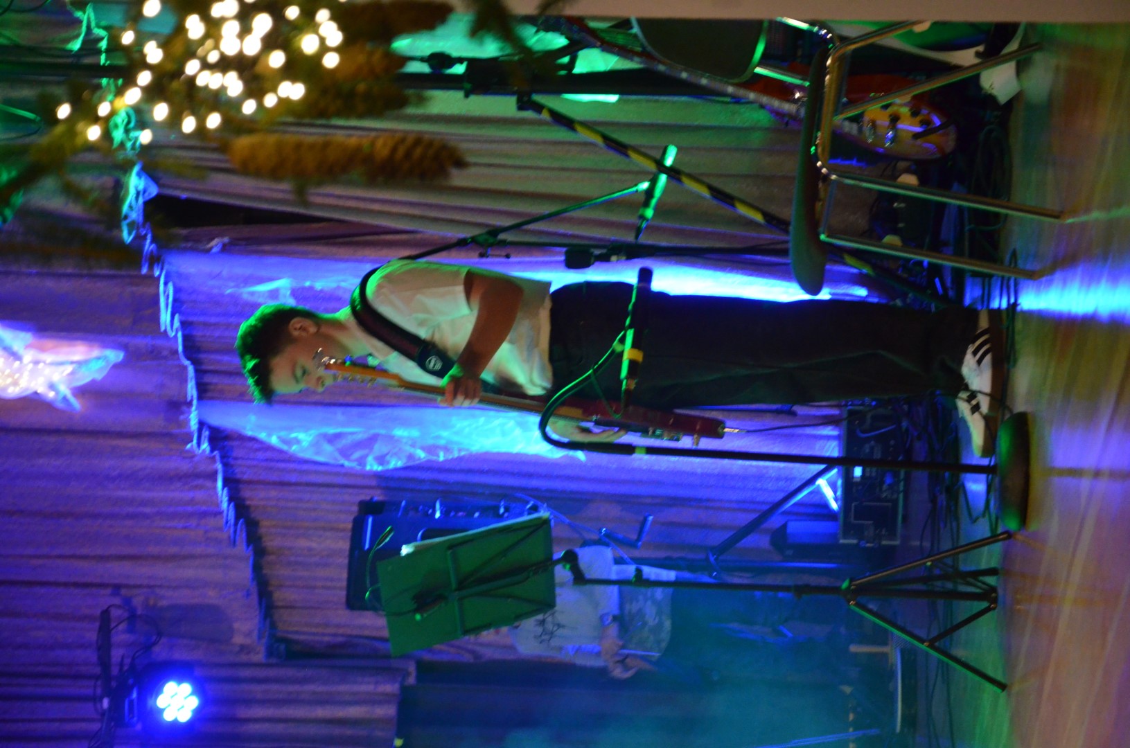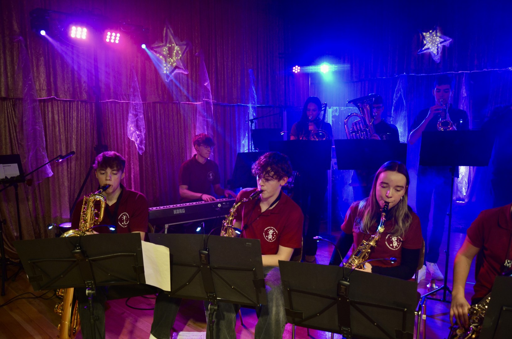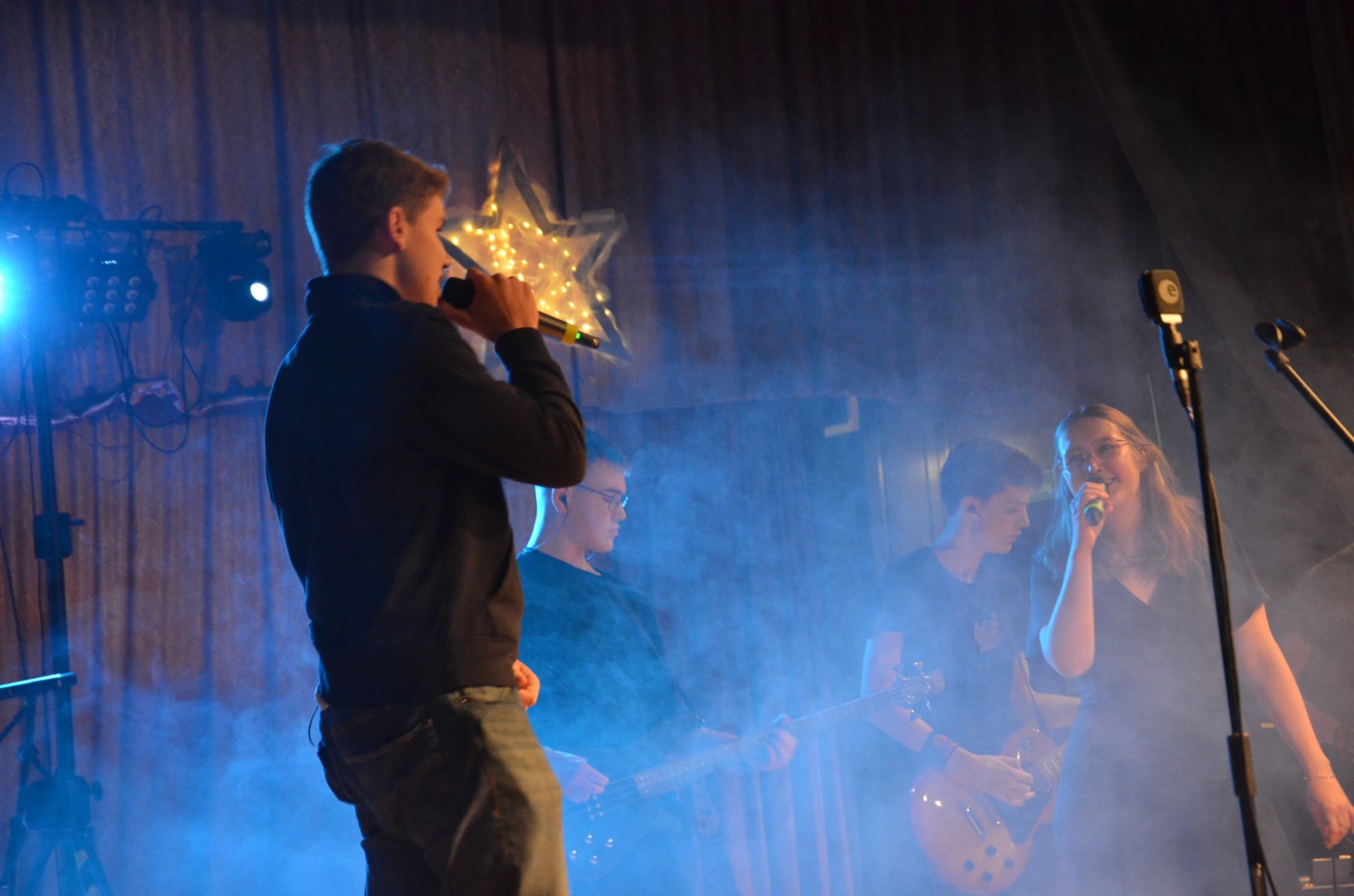 Drei Bands traten im Anschluss auf und sorgten für eine musikalische Reise durch verschiedene Genres. Die Juniorband, geleitet von Christina Guhl, begann u.a. sanft mit „Jingle Bells“ und „O Come All Ye Faithful“, gefolgt von der Schülerband, die ihren ersten, aber sicherlich nicht letzten Auftritt meisterte. Mit einer kraftvollen Interpretation des „Little Drummer Boy“ und Shakin’ Stevens‘ „Merry Christmas Everyone“ animierten die Schülerin und die Schüler der Oberstufe das Publikum zum Mitsingen und heizten mit dem energiegeladenen „Narcotic“ von „Liquido“ den Saal ein.