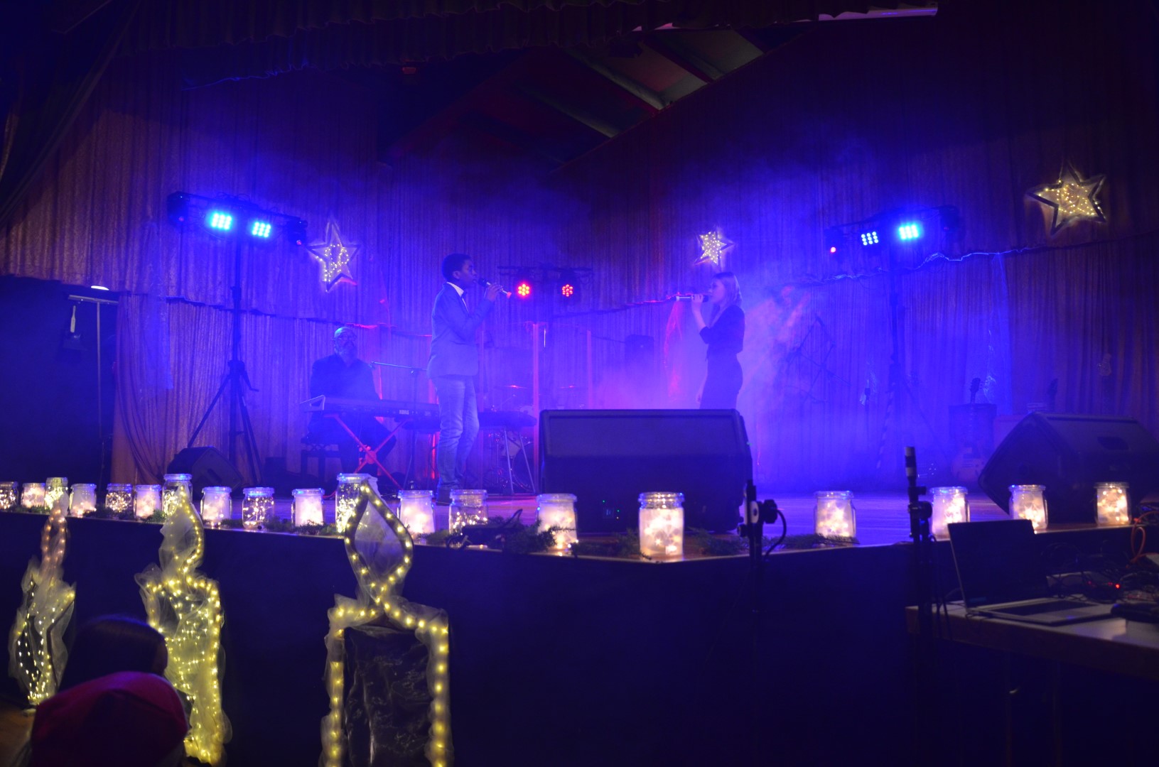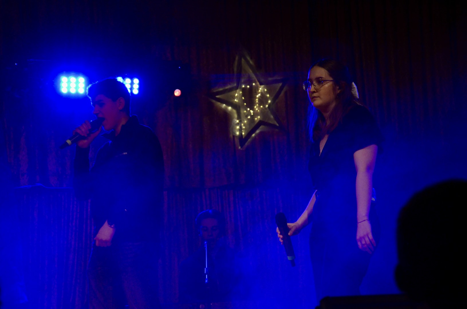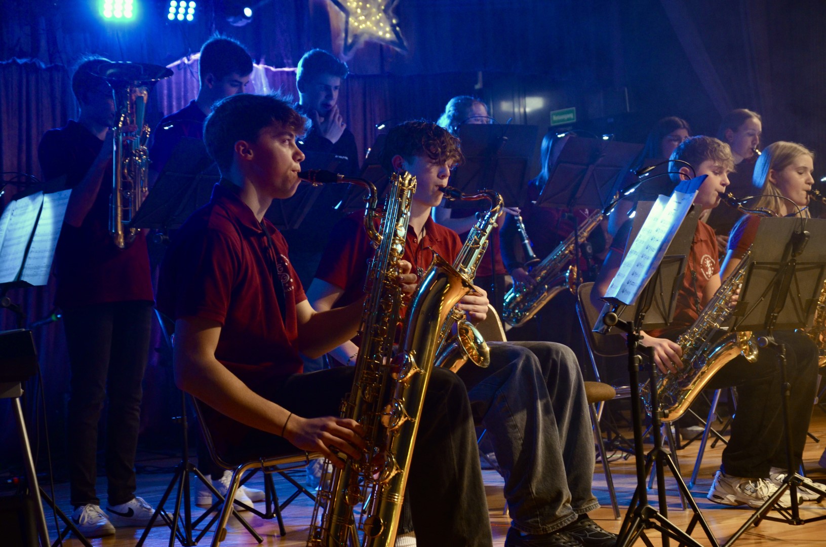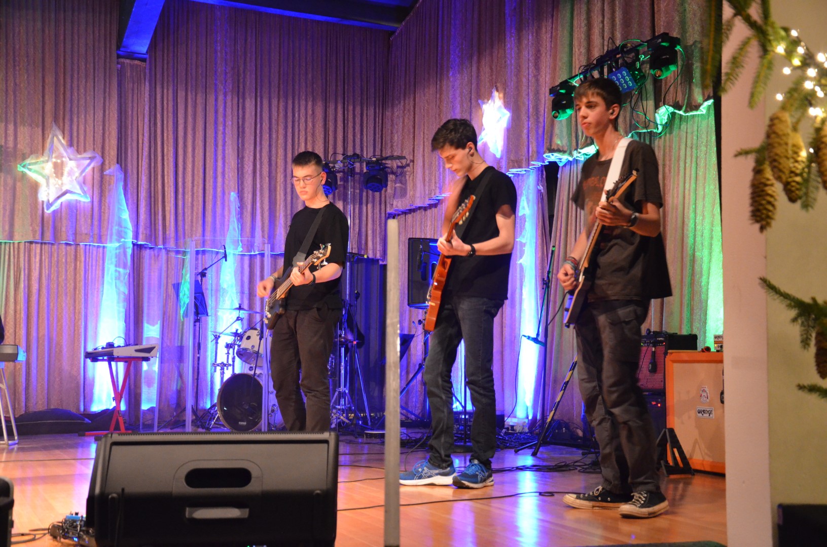 Drei Bands traten im Anschluss auf und sorgten für eine musikalische Reise durch verschiedene Genres. Die Juniorband, geleitet von Christina Guhl, begann u.a. sanft mit „Jingle Bells“ und „O Come All Ye Faithful“, gefolgt von der Schülerband, die ihren ersten, aber sicherlich nicht letzten Auftritt meisterte. Mit einer kraftvollen Interpretation des „Little Drummer Boy“ und Shakin’ Stevens‘ „Merry Christmas Everyone“ animierten die Schülerin und die Schüler der Oberstufe das Publikum zum Mitsingen und heizten mit dem energiegeladenen „Narcotic“ von „Liquido“ den Saal ein.