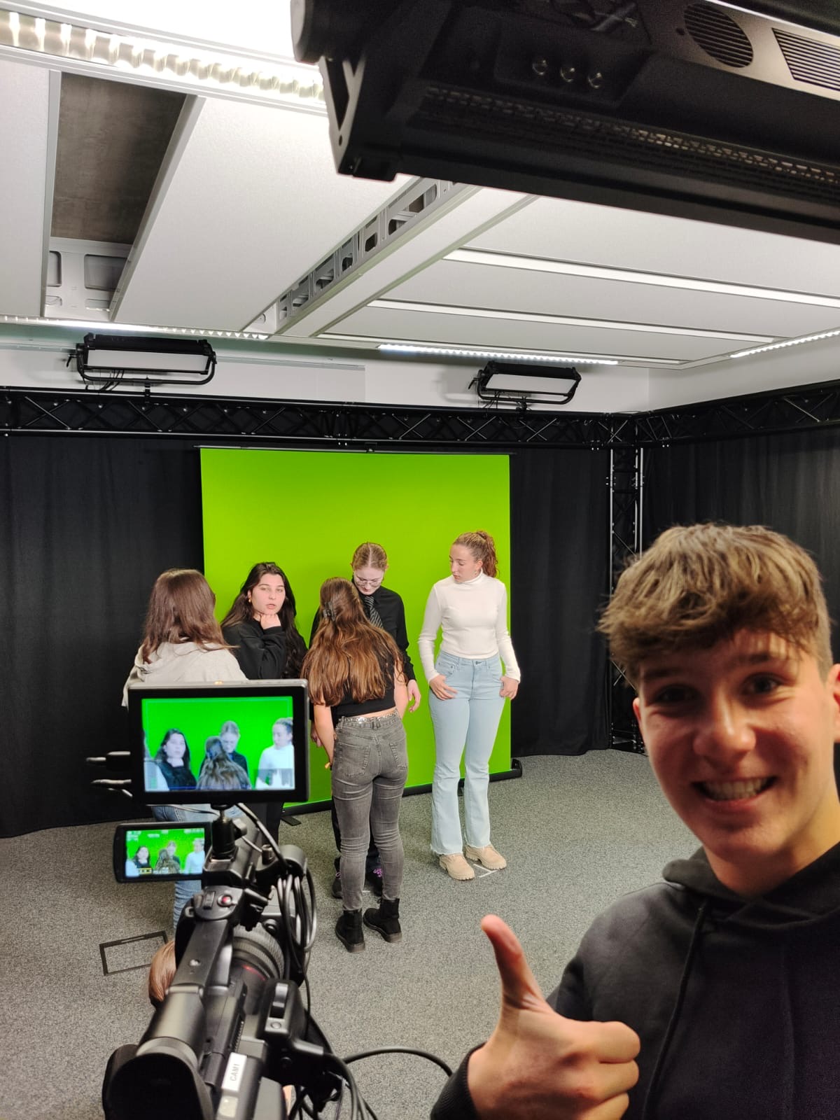 Einen weiteren Blick in die Medien bot der Ausflug in das Filmstudio des Medienzentrums Lahn-Dill in Wetzlar, in welchem die Schülerinnen und Schüler eine eigene Nachrichtenshow aufnehmen konnten. Thematisch konzentrierten sich diese alle auf ein Zukunftsthema, wie z.B. ein fiktiver Bericht über einen neu entwickelten Impfstoff gegen Krebs.
