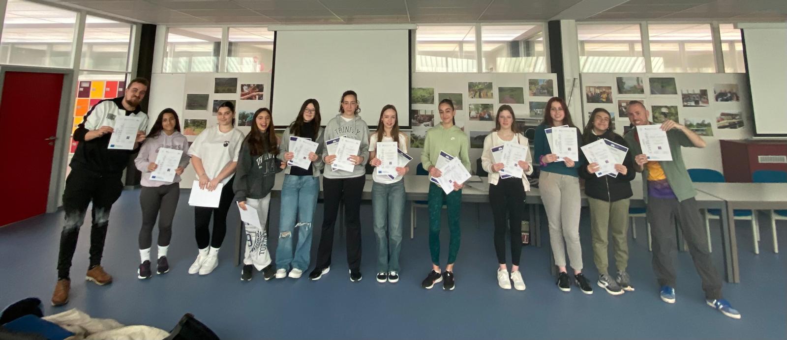 Am letzten Schultag erhielten die Schülerinnen und Schüler ihre Erasmus-Zertifikate. In der Kultur und Sporthalle stand mit ausgiebigen Volleyball-Spielen anschließend viel Bewegung auf dem Programm. Der aufkommende Hunger wurde durch gemeinsames Kochen vertrieben. Die Schülerinnen und Schüler der Europaschule haben sich für Kartoffelpuffer, Kräuterquark, Rote Grütze und Vanillesoße entschieden.