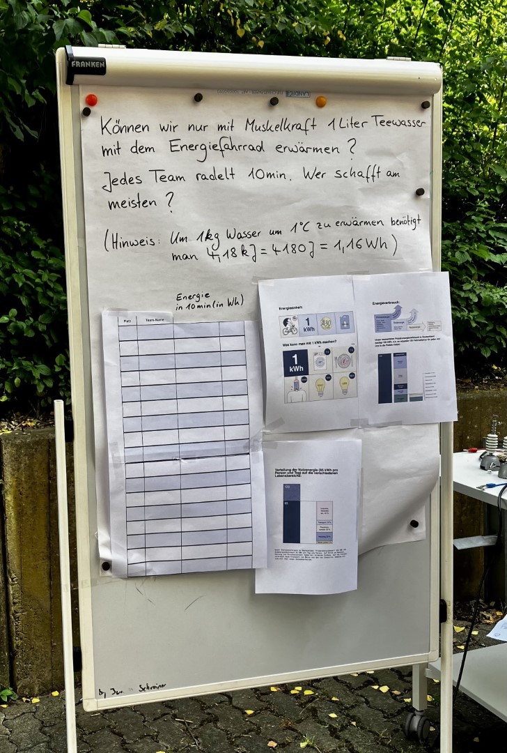 Parallel versuchten die 10G-Klassen mit Hilfe eines Fahrrads die notwendige Energie bereitzustellen, die zum Kochen von 1 Liter Teewasser benötigt wird. Nach einer erreichten Temperatur von ca. 50° gaben die Schülerinnen und Schüler jedoch auf – dass so viel „Beinenergie“ notwendig ist, damit haben wohl die wenigsten gerechnet.