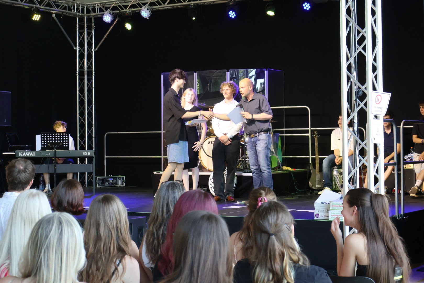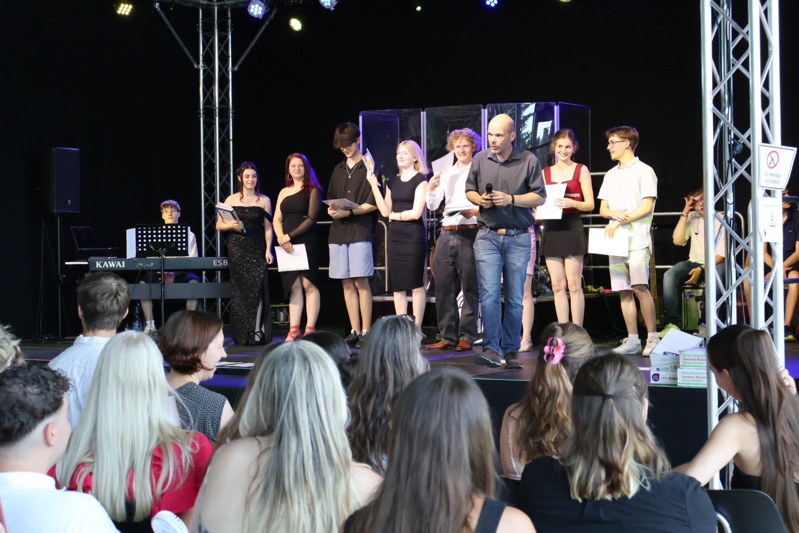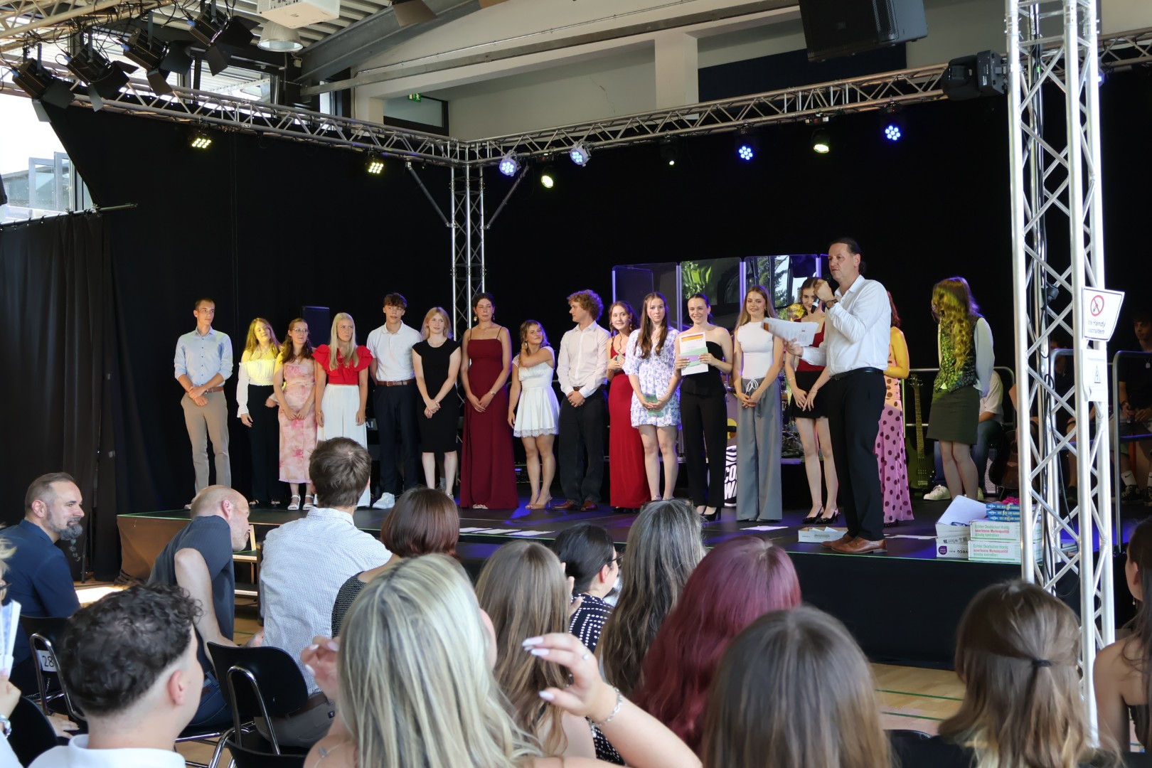 Viele Ehrungen rundeten die Feier ab: Die 16 besten Absolventinnen und Absolventen wurden gewürdigt, ebenso engagierte Juniorbotschafterinnen und -botschafter sowie Schülerinnen und Schüler, die im MINT-Bereich herausragende Leistungen erbracht haben. Besonders hervorzuheben ist Oscar Lang, der mehrfach ausgezeichnet wurde: Neben Ehrungen in den Fächern Mathematik und Informatik wurde er als Juniorbotschafter gewürdigt, erreichte sein Abitur mit der Note 1,0 und wurde zudem für sein außerordentliches Engagement von der Studienstiftung des deutschen Volkes ausgezeichnet.