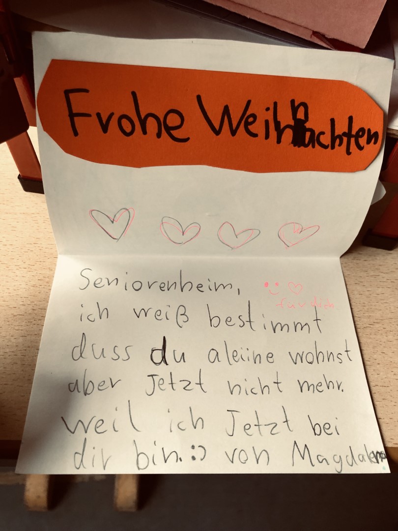 In der letzten Schulwoche überbrachte die Klasse 3P1 gemeinsam mit Frau Kraus und Frau Bender stellvertretend für die Grundschule die selbst gestalteten Karten persönlich den Senioren. Dieses Projekt förderte nicht nur die Kreativität der Kinder, sondern auch das soziale Lernen. Durch das Schreiben und Basteln der Karten konnten die Schülerinnen und Schüler Empathie entwickeln und ein Bewusstsein für ältere Menschen schaffen.