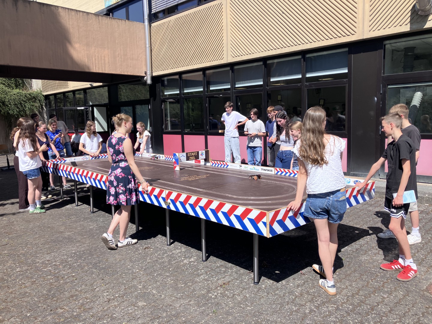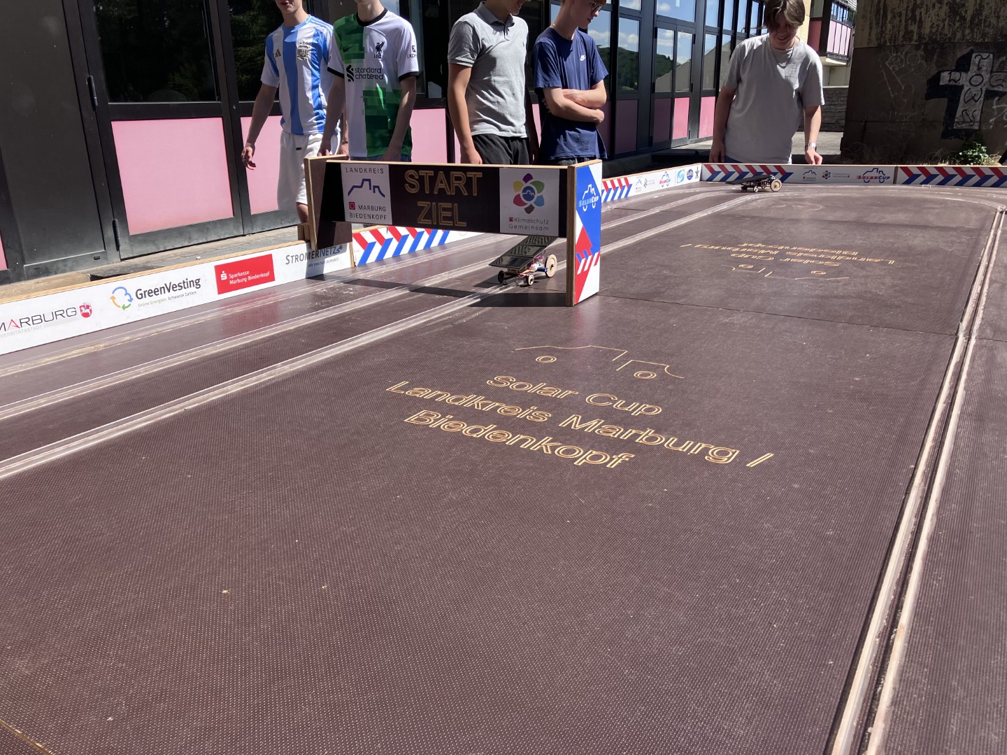 Der SolarCup wird seit 2019 jährlich an der Europaschule durchgeführt. Im Gegensatz zu den Vorjahren wurden dieses Jahr keine neuen Bausätze angeschafft, sondern mit recycelten Materialien gearbeitet. Das sparte nicht nur Kosten, sondern förderte auch die Ressourcenschonung im Sinne der Nachhaltigkeit. Ein weiterer Vorteil: Das sonnige Wetter zeigte sich in diesem Jahr verlässlicher, wodurch die Fahrzeuge durch die zusätzliche Geschwindigkeit manchmal sogar aus den Kurven flogen.