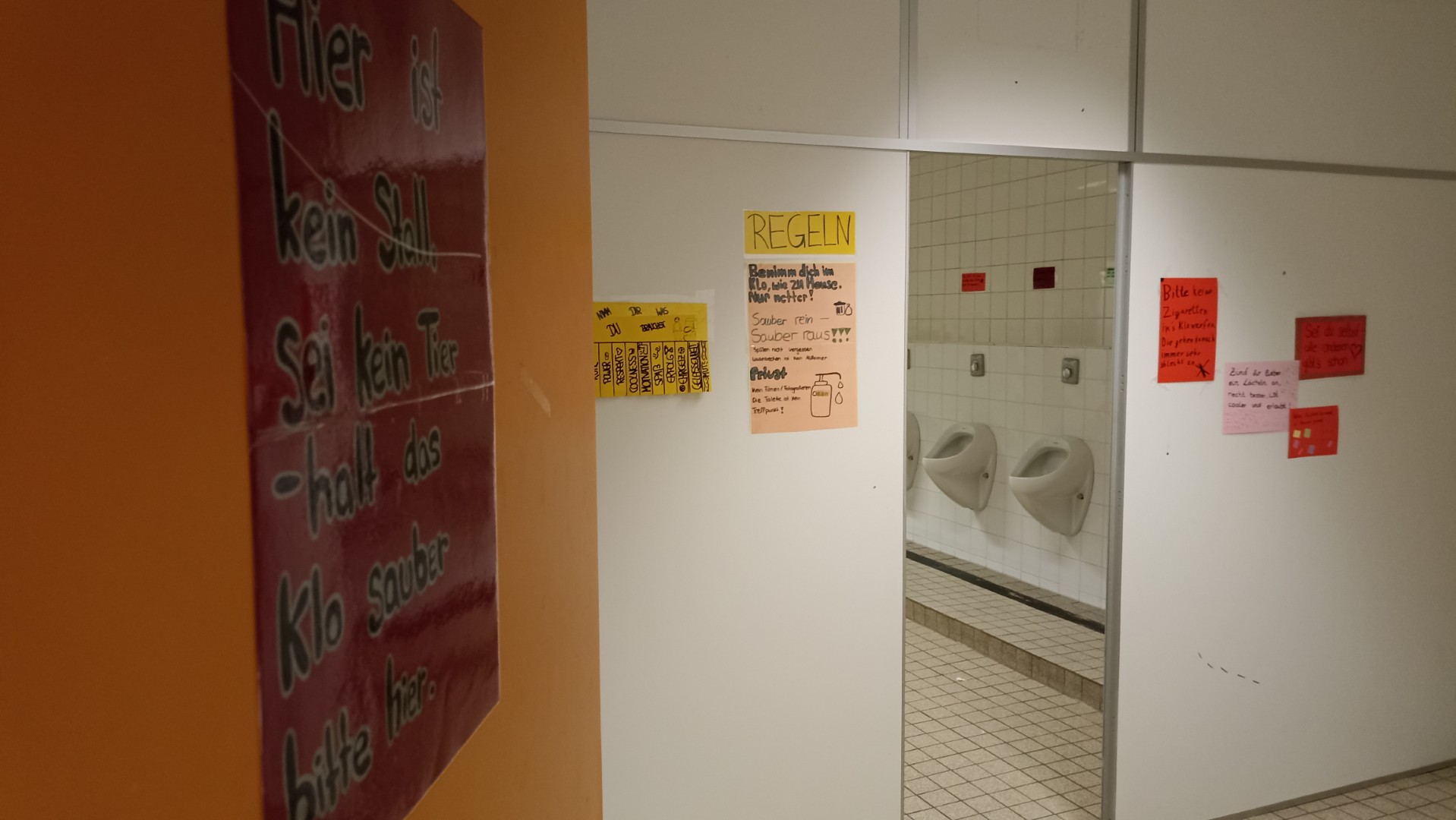 Doch statt nur zu meckern, wurde gehandelt! Im Rahmen des Projekts „Mutzone statt Grauzone“ mit Frau Blatt und Frau Bunte gestalteten engagierte Schülerinnen und Schüler aus verschiedensten Klassen kreative und humorvolle Sprüche rund um Sauberkeit, Rücksicht und Verantwortung. Diese wurden bunt gestaltet und in den Toiletten bei den Tischtennishallen aufgehängt – mit dem Ziel, zum Nachdenken und Schmunzeln anzuregen.