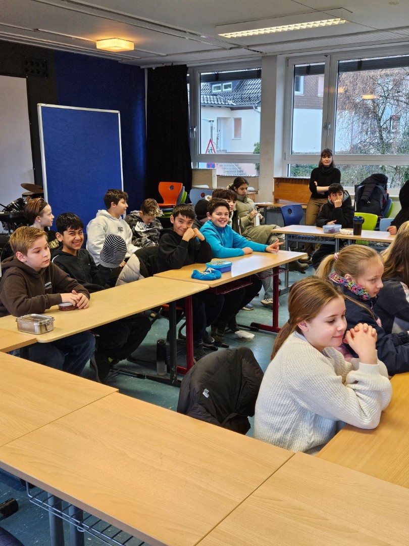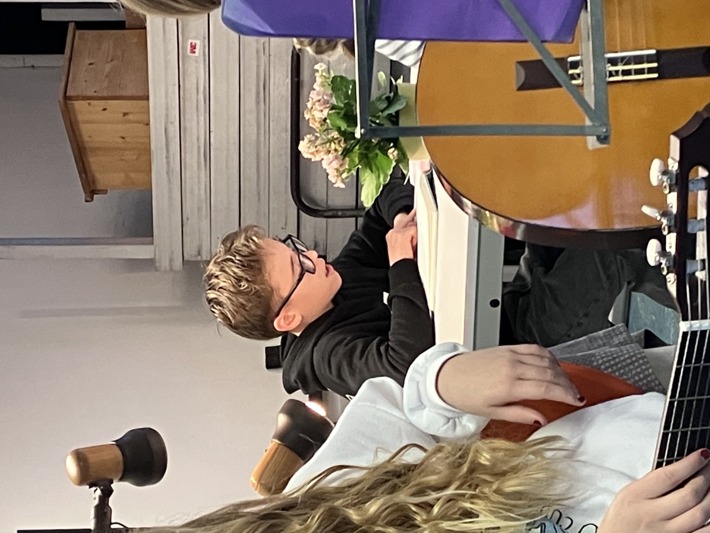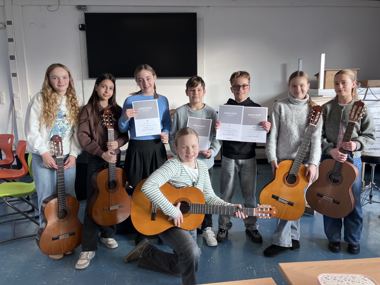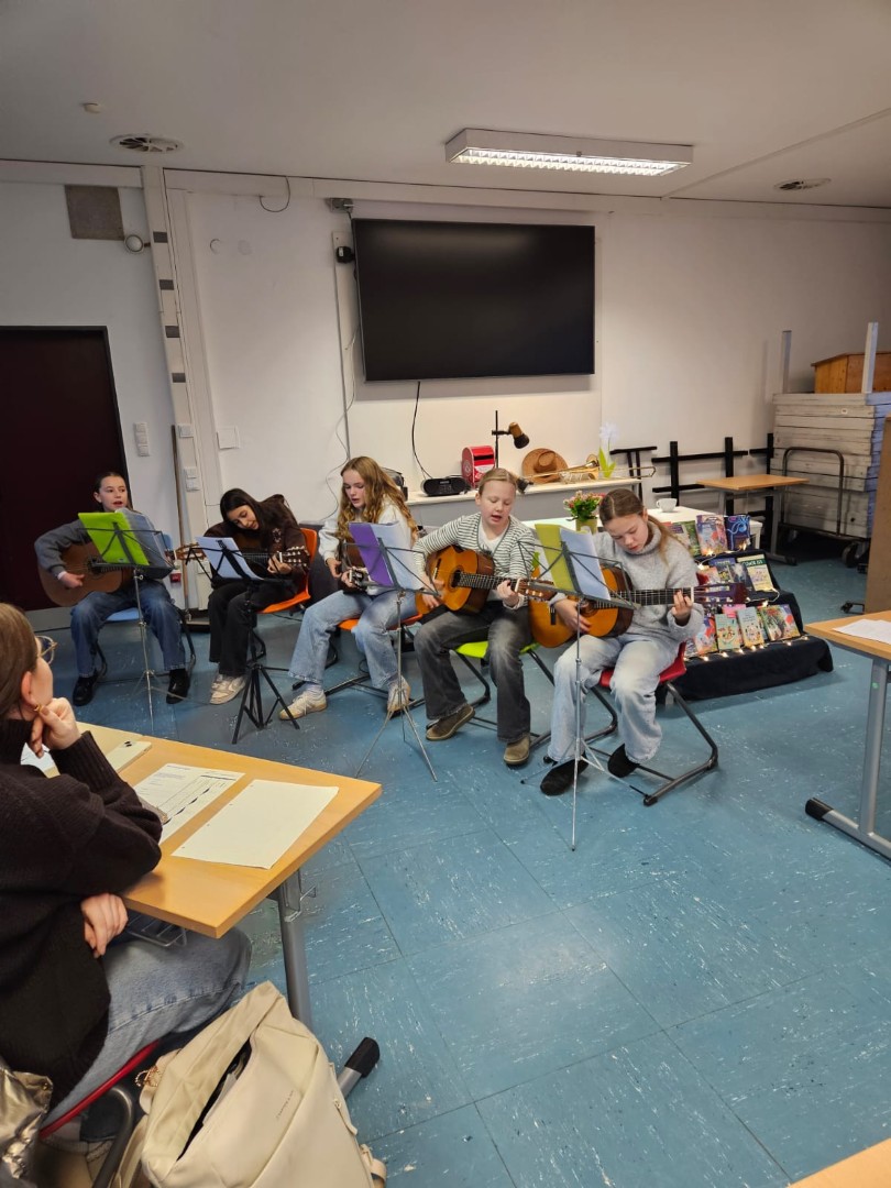Musikalisch unterstützt wurde die Veranstaltung von vier Gitarrenspielerinnen aus dem 6. Jahrgang. Sie sorgten mit den Songs „Applaus, Applaus“ (Sportfreunde Stiller) und „Ich liebe den Frühling“ (S. Sommerland) für eine gemütliche, feierliche Atmosphäre.